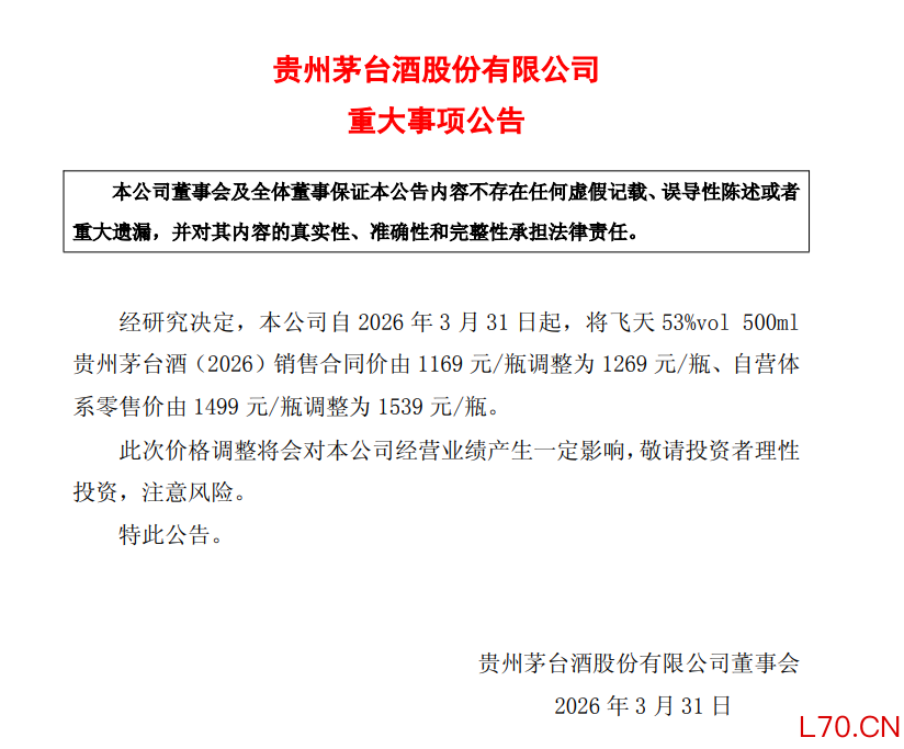 2026年3月30日,茅台宣布对旗下核心产品飞天53度飞天茅台酒(2026)进行价格调整。自2026年3月31日起,该产品的销售合同价由1169元/瓶上调至1269元/瓶,自营体系零售价则由1499元/瓶调整为1539元/瓶。