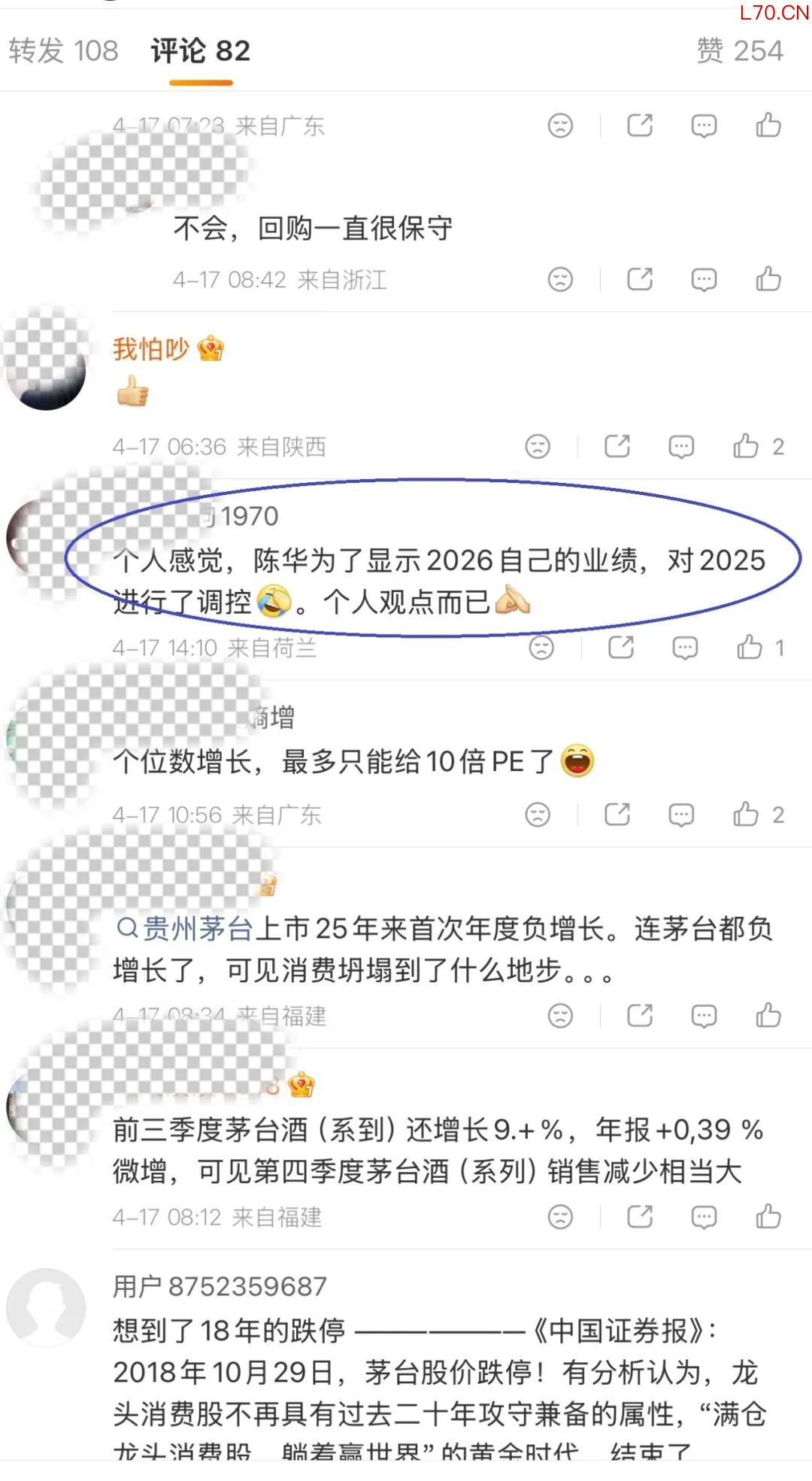 对于白酒企业来说,第四季度是经销商为春节备货的生命线,也是传统的出货旺季,然而,贵州茅台第四季度营收、净利大幅下滑,广告费用等却突然飙涨。这种背离也引发猜测,在大家更多质疑茅台年底终端动销或者渠道的拿货意愿已遭遇极大阻力之时,也有网友就提出了这样的质疑:这是陈华为了显示2026年自己的业绩,对2025年进行了调控。