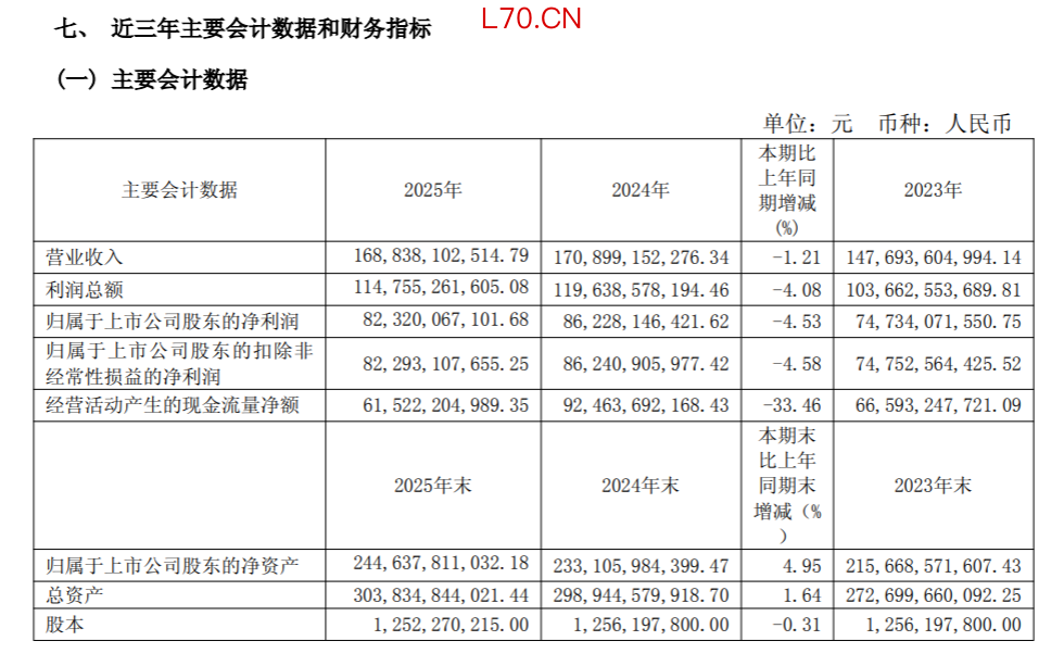 如今贵州茅台交出的2025年年报显示,公司实现营业收入1688.38亿元,同比减少1.21%;净利润823.20亿元,同比下降4.53%。