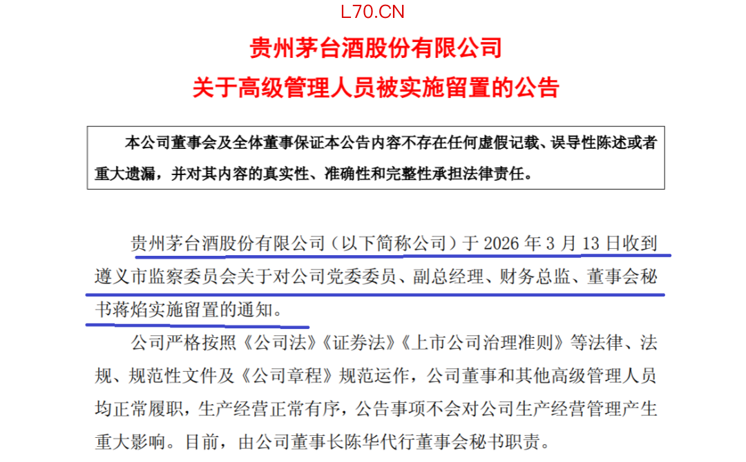 此次业绩报告,蒋焰名字已不在茅台年报中。原因就是今年3月13日茅台发布的《贵州茅台酒股份有限公司关于高级管理人员被实施留置的公告》。公告称,公司收到遵义市监察委员会关于对公司党委委员、副总经理、财务总监、董事会秘书蒋焰实施留置的通知。