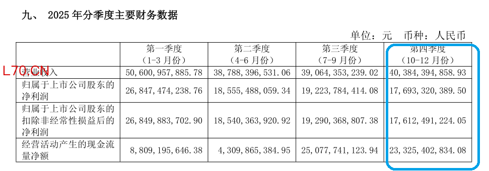 最让外界质疑的是贵州茅台2025年第四季度业绩单。