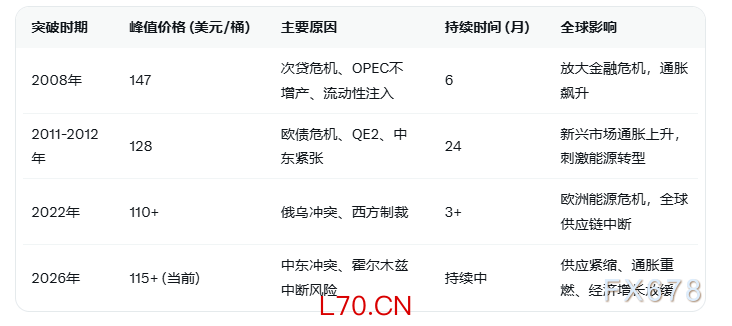 历史三次突破均源于地缘政治紧张与宏观经济因素交织。2008年次贷危机引发流动性注入与OPEC限产;2011-2012年欧债危机下QE宽松叠加中东动荡;2022年俄乌冲突导致制裁与供应中断。当前第四次则由中东冲突升级、霍尔木兹海峡风险主导,反映全球能源脆弱性。