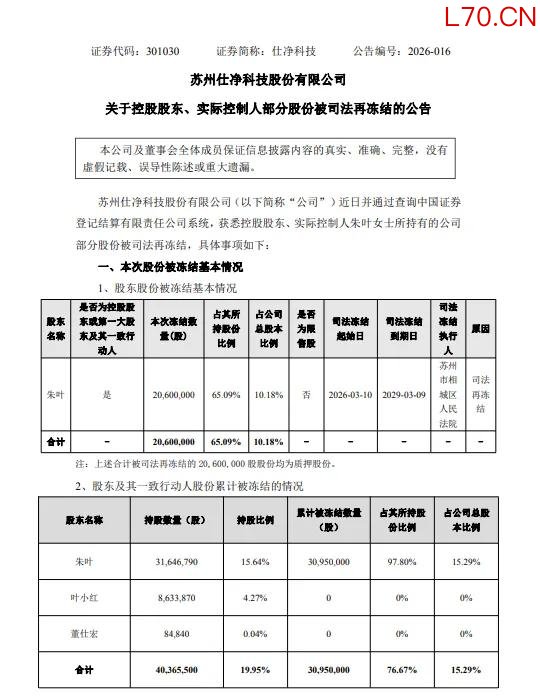 3月12日,仕净科技(301030)公告称,公司近日并通过查询中国证券登记结算有限责任公司系统,获悉控股股东、实际控制人朱叶女士所持有的公司部分股份被司法再冻结。