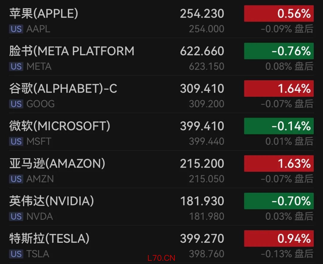大型科技股表现分化。特斯拉上涨0.94%,亚马逊上涨1.63%,苹果上涨0.56%,谷歌-A上涨1.75%。英伟达下跌0.70%,博通下跌1.11%,微软下跌0.14%,Meta下跌0.76%,超威半导体下跌0.14%。