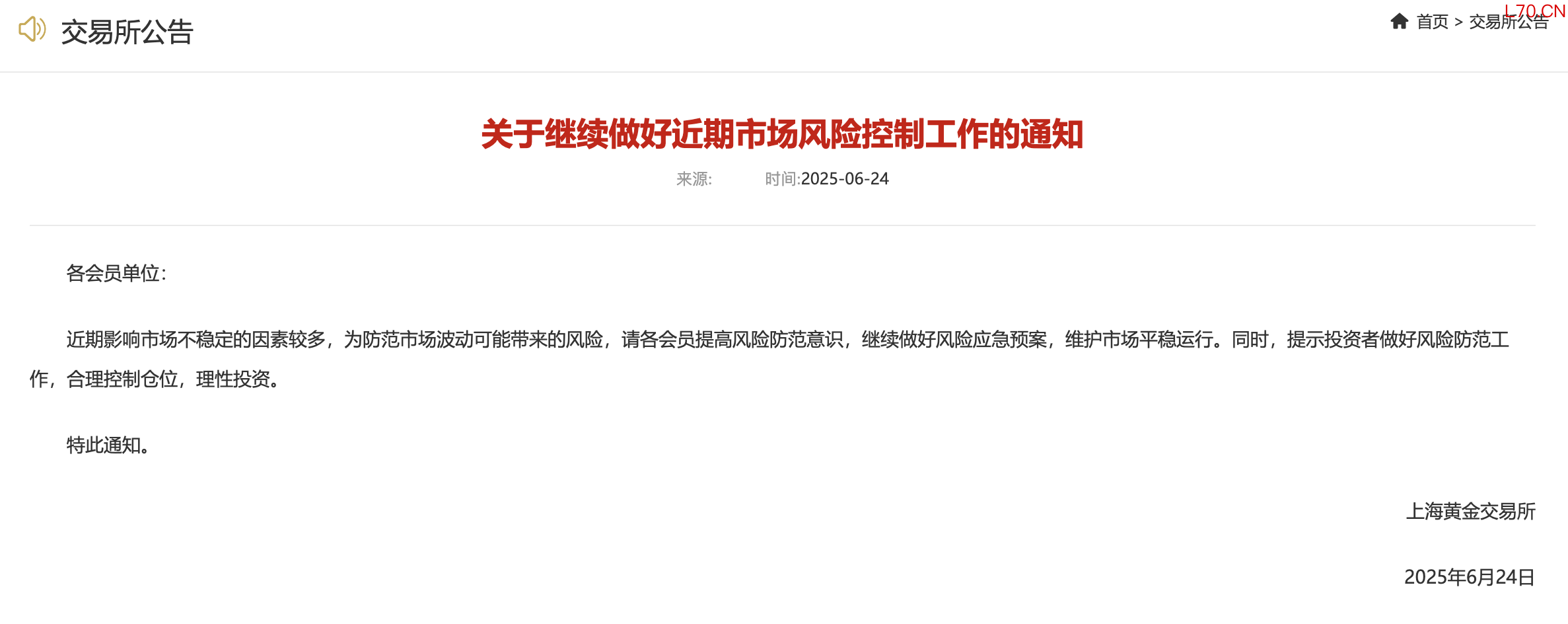 上金所发布关于继续做好近期市场风险控制工作的通知