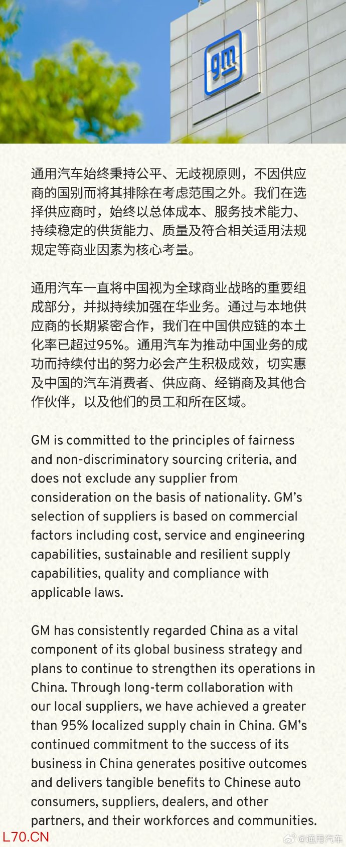 通用汽车:公司在中国供应链的本土化率已超过95%