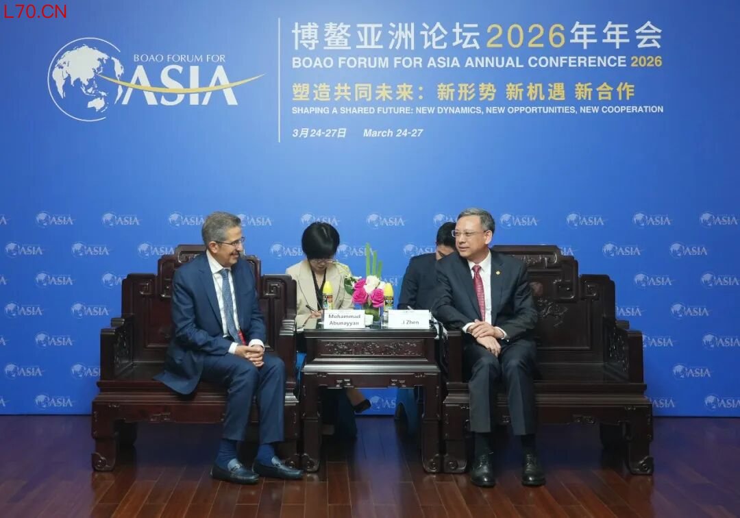 3月25日,中国能建党委书记、董事长倪真在海南博鳌与来华参加博鳌亚洲论坛2026年年会的Acwa创始人、董事会主席穆罕默德·阿布纳扬会谈。双方就深化业务开发合作,加强技术创新协同,携手促进全球绿色转型进行深入交流。