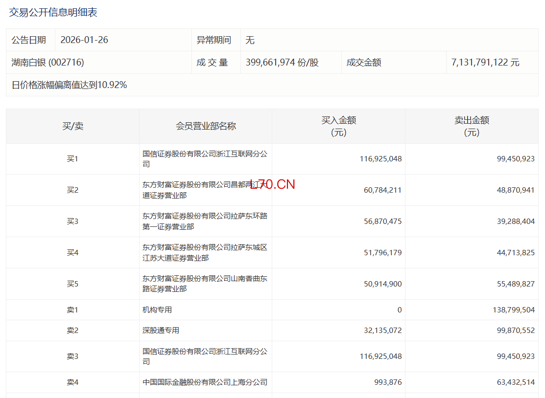湖南白银今日涨停配资排行2026,有1家机构专用席位净卖出1.39亿元