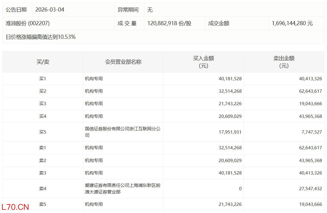 准油股份今日涨停,有3家机构专用席位净卖出5371.75万元