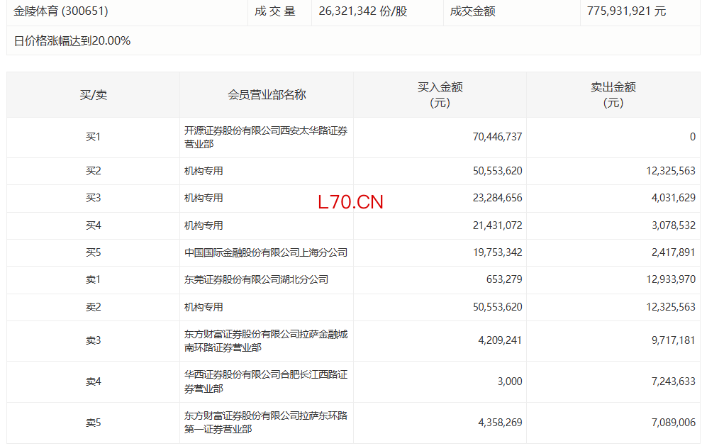 金陵体育今日涨20.00% 3家机构专用席位净买入7583.36万元