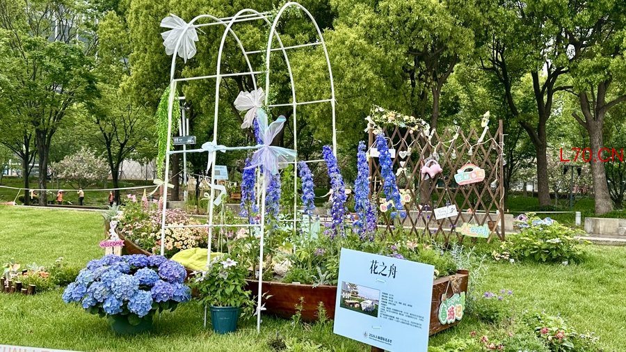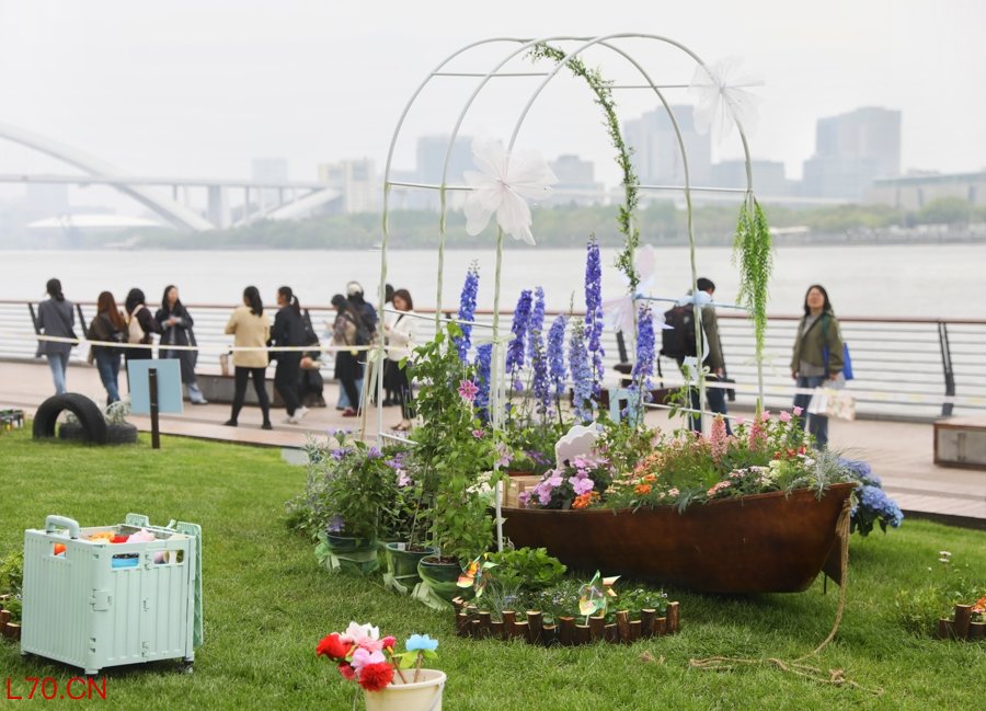 在江边,家住徐家汇街道的陶睿茜正在“花之舟”中布置植物。一叶轻舟上,蓝紫色的大花飞燕草迎风摇曳,游客可以在这里体验钓鱼、投花壶、吹泡泡等游戏,找回自己的童年记忆。