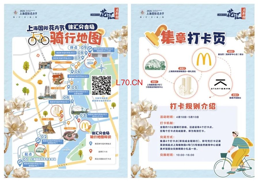 令人期待的是,今年徐汇分会场还联动上海植物园主会场设置了“骑行+步行”路线,这也将是上海最“绿”最“花”的骑行线。沿途还有定制景观美团车和临时停放点,集章还可领取礼品。