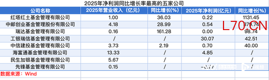 值得关注的是,2025年公募基金行业涌现出一批逆势高增长的公司,净利润增速表现十分突出。在净利润同比增长率最高的十家公司中,红塔红土基金以1131.45%的惊人增速位居榜首,2025年实现营收1.00亿元,同比增长36.03%,净利润0.22亿元。