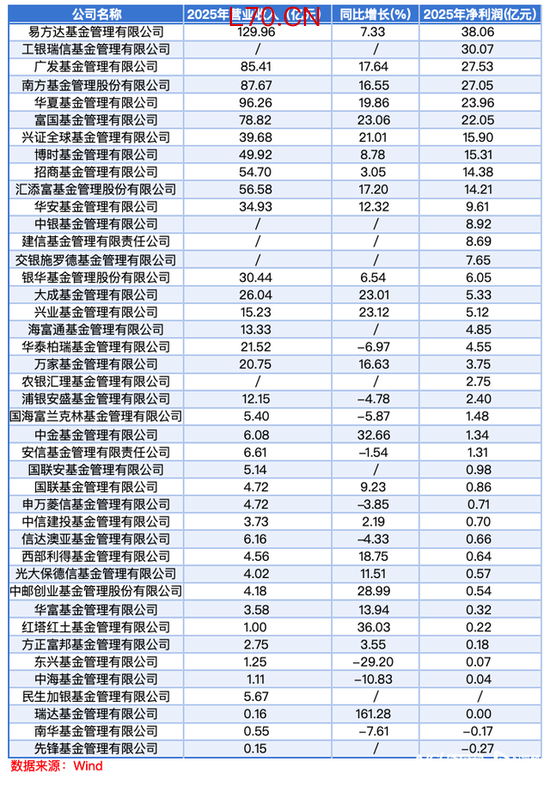 随着2025年财报披露陆续收官,公募基金行业年度业绩全貌正式揭晓。南都·湾财社记者统计超40家公募基金公司披露的财务数据发现,2025年公募基金行业在整体呈现“营收稳增、利润高增”的良好态势的同时,内部分化进一步加剧,头部效应与中小公司突围并存成为行业发展的鲜明特征,既有公司实现净利润超10倍增长,也有7家公司陷入营收净利润“双降”困境。