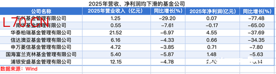 与高增长公司形成鲜明对比,2025年共有7家基金公司面临营收和净利润同比双双下滑的困境,分别为华泰柏瑞基金、浦银安盛基金、信达澳亚基金、申万菱信基金、国海富兰克林基金、南华基金、东兴基金。