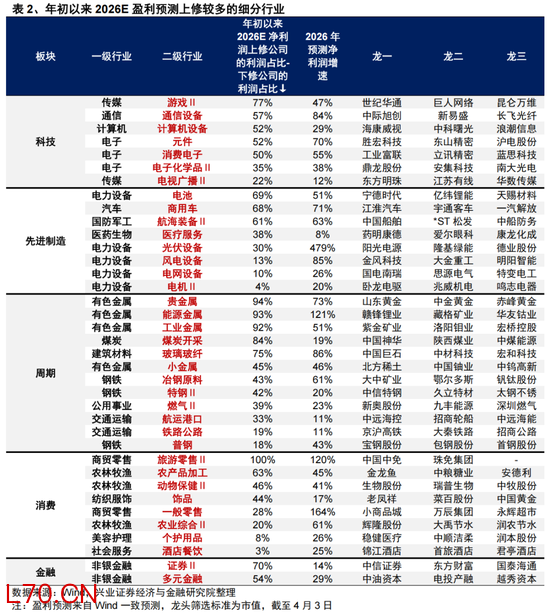 细分行业方面,通过年初以来2026年盈利预测上修情况,筛选一季报有望表现较好的方向,主要集中在: