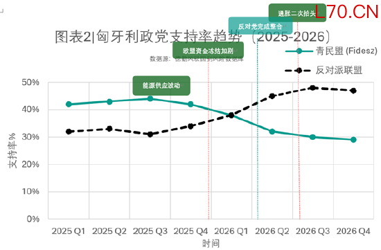 图表 2匈牙利大选主要阵营支持率时间趋势线(2025.1–2026.4)