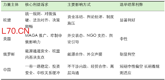 这场选举从一开始就不是单纯的内政。欧盟、美国、俄罗斯、中国四方利益在此深度交织,每一方都有清晰诉求,也潜移默化的影响选举走向。