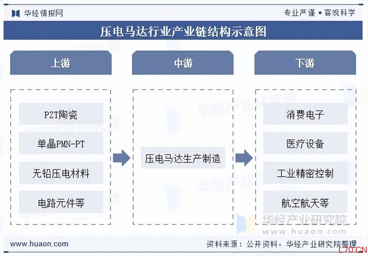 压电马达产业链上游涵盖压电材料研发与供应、驱动电路元件及精密加工配件。中游为马达制造环节,包括结构设计、组装工艺及性能测试。下游应用领域广泛,涉及消费电子、医疗设备、工业精密控制及航空航天,形成“材料-制造-应用”的完整闭环,驱动高端装备智能化升级。
